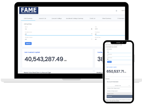 FAME (“Financial Access Made Easy”) is an integrated online investment platform from FAME Platform Sdn Bhd which is part of PhillipCapital Group Malaysia. The platform was first launched in year 2005 to seamlessly connect our business partners such as agents, financial planning firms and financial institutions with their clients to a wide variety of assets including units trusts, equities, ETFs and more. The FAME platform caters the ability to be white-labelled and have all investment assets of each client to be monitored under a single account.